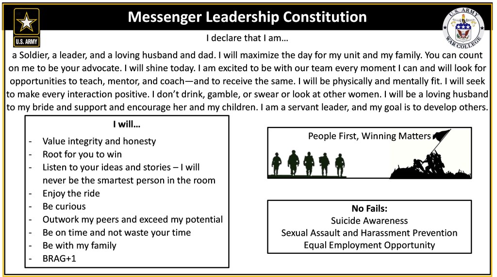 As I stood there describing my Leadership Constitution, the excitement came not because of the words I was saying, but from knowing the high standards I was setting for myself. I was now publicly accountable to everyone in the room (and Teams), and that was a good—albeit scary—thing; scary because I, like all of us, am a very fallible person.