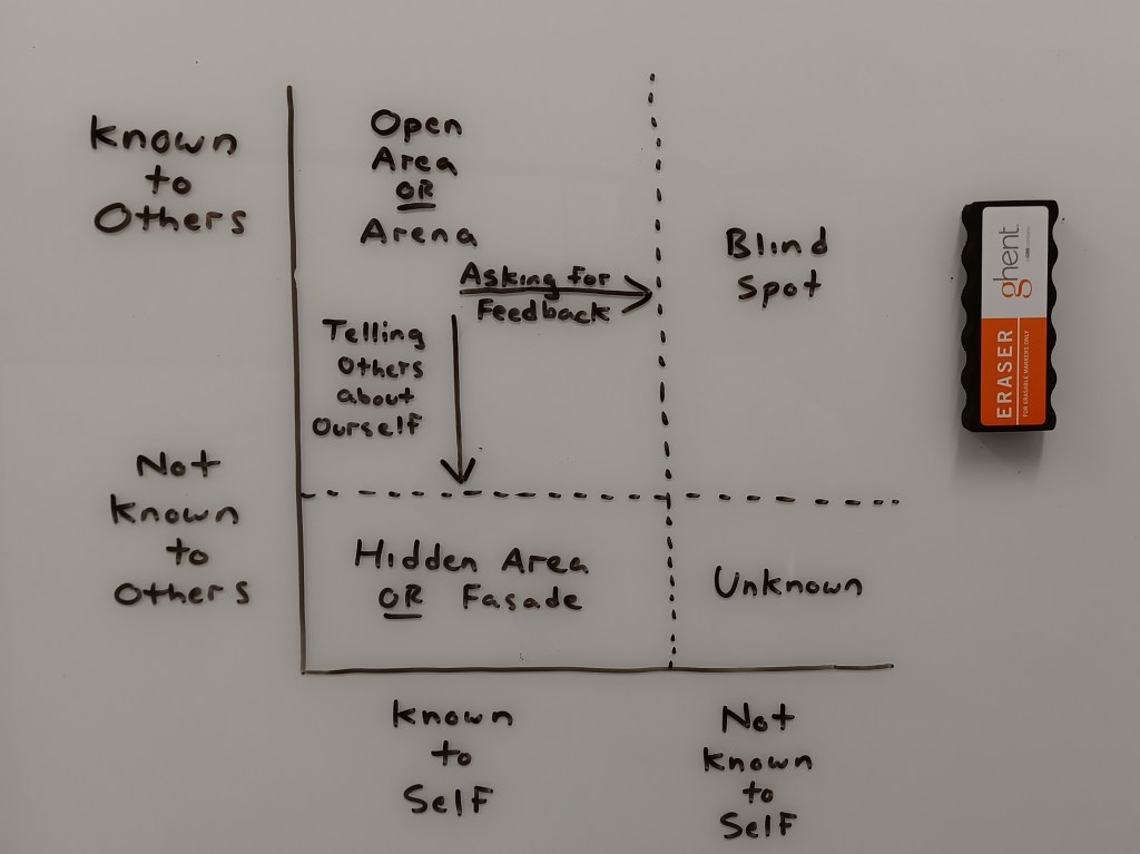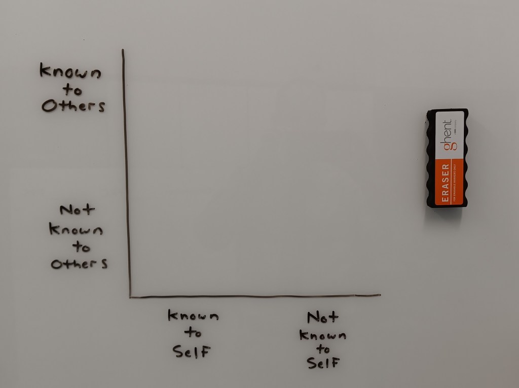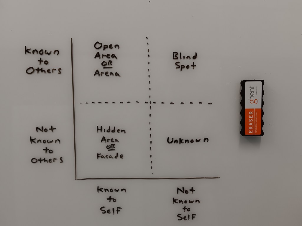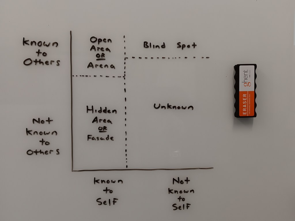 Bryan gave a genuine smile and leaned back in his chair, “Sounds like you’re suffering from what we all suffer with. Blind spots.” Then he asked, “Have you heard about the Johari Window?” and went to the whiteboard and drew a simple picture. “Let me explain.”