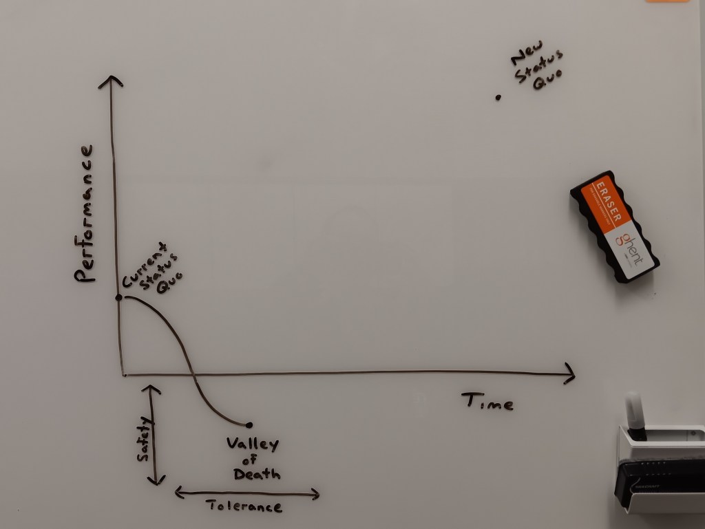 Here, I had fallen into this “period of disruption.” Initially, there’s an adverse impact on performance, and it all qualifies as risk to the organization. The depth of the dip is the amount of safety I and everyone around me are willing to accept.  On the treadmill, if I want less safety I could lower the incline. This may not give as much benefit in the long run, but it will lessen the risk. Or, I could raise the incline to 15% and feel more pain with the confidence of larger gains at the end.