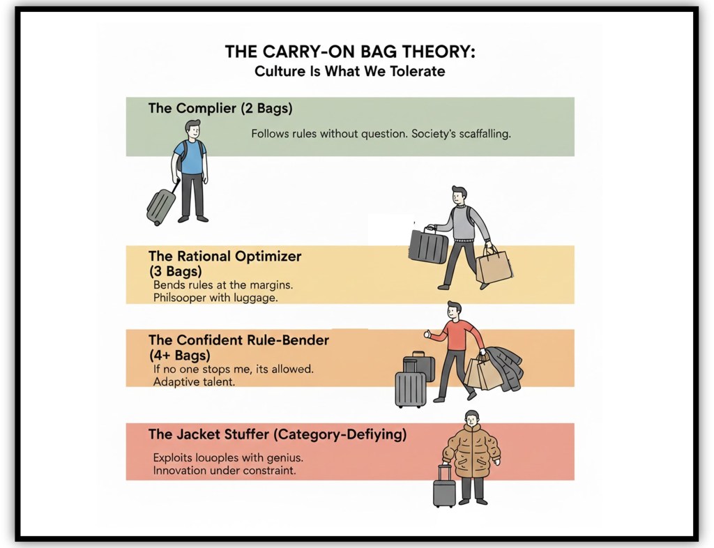 For anyone responsible for organizational culture whether running a Fortune 500 company, a military unit, a school, or a mid-sized regional airline with chronic overhead-bin problems, the Carry-On Bag Theory is not merely a metaphor. It functions as a diagnostic tool and a behavioral mirror we can hold up to the systems we oversee.