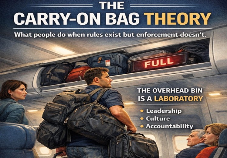 For anyone responsible for organizational culture whether running a Fortune 500 company, a military unit, a school, or a mid-sized regional airline with chronic overhead-bin problems, the Carry-On Bag Theory is not merely a metaphor. It functions as a diagnostic tool and a behavioral mirror we can hold up to the systems we oversee.