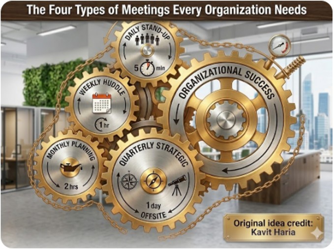 The problem may be too many meetings, yes, but we should focus on increasing that 11% of reported non-productive time. That could mean eliminating them. But better, it certainly means making each gathering more useful to employees. To do so, we should focus on four core meetings that every organization needs, adapted from Kavit Haria with my spin on it.
